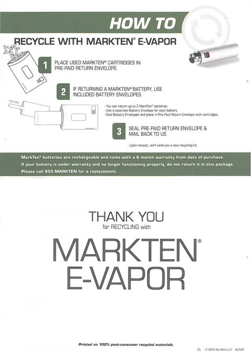 Direct mail received from MarkTen in October of 2014. The direct mail piece includes a pre-paid envelope to mail old batteries back to MarkTen to be recycled. All envelopes and pieces included are made from recycled paper.