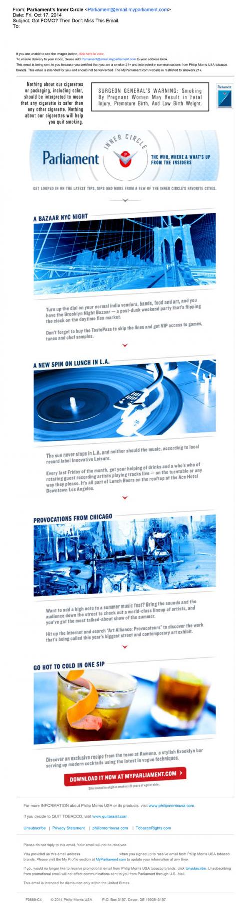 Email from Parliament Inner Circle received October 17, 2014 giving users the inside scoop and tips on the Inner Circle's favorite cities. Email features NYC, LA, and Chicago. text: "Parliament Inner Circle: The who, where, & what's up from the insiders. get looped in on the latest tips. sips and more form a few of the inner circle's favorite cities."