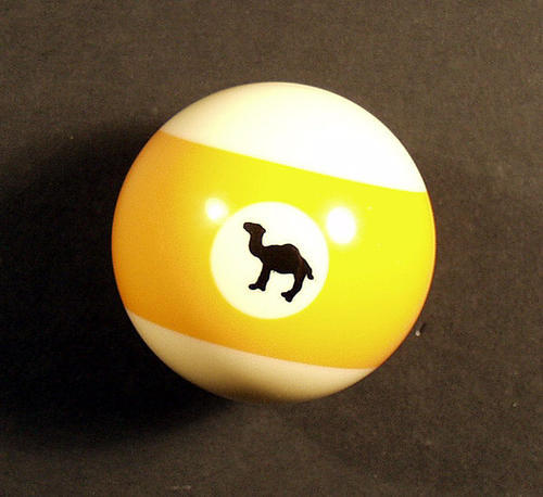 Pool table ball, white with orange stripe. Camel instead of number shown