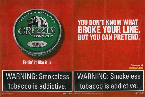 Two page Grizzly ad promoting their Premium Wintergreen, Long cut product and prompting the reader to see more at mygrizzly.com. From the "Tellin' it like it is" ad campaign. Text: "You Don't Know What Broke Your Line. But You Can Pretend."