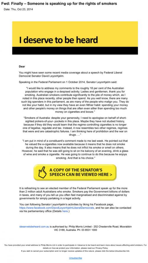 Philip Morris campaign "I deserve to be heard" in October 2014 to a recipient in Australia. The email highlights a recent speech made in Parliament targeted towards "the roughly 18 per cent of the Australian population who engage in a despised activity," smokers. The speaker thanks smokers for contributing so much money to the government via taxes, and derides those who would malign smokers. He likens the current state of tobacco regulation to prohibition and the war on drugs.