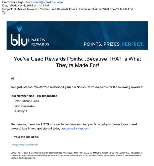 Email from blu confirming the redemption of Rewards Points towards a free gift; in this case, a blue Disposable product.