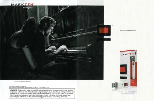 Magazine ad from MarkTen with text "Play whatever you feel."  Picture shows a man playing the piano while vaping, with a woman sitting behind holding him. Small picture shows product and USB charger with MarkTen symbol on it. Additional text says "The only e-vapor with FourDraw technology for a full draw."