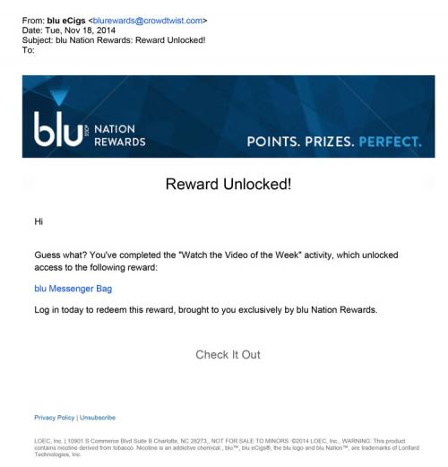 Email received from blu November 2014 to inform user that new rewards have been unlocked on blu nation. Email also reminds user to log in to redeem points. Text: "Log in today to redeem these rewards, brought to you exclusively by blu Nation Rewards."