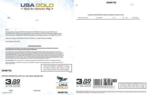 Direct mail letter from USA Gold thanking the recipient for participating in the Home for the Holidays Giveaway. They remind the recipient to visit the brand website daily for more chances to win, and also include instructions on how to enter by texting with a mobile phone. The letter includes a coupon and a list of retailers close to the customer's address.