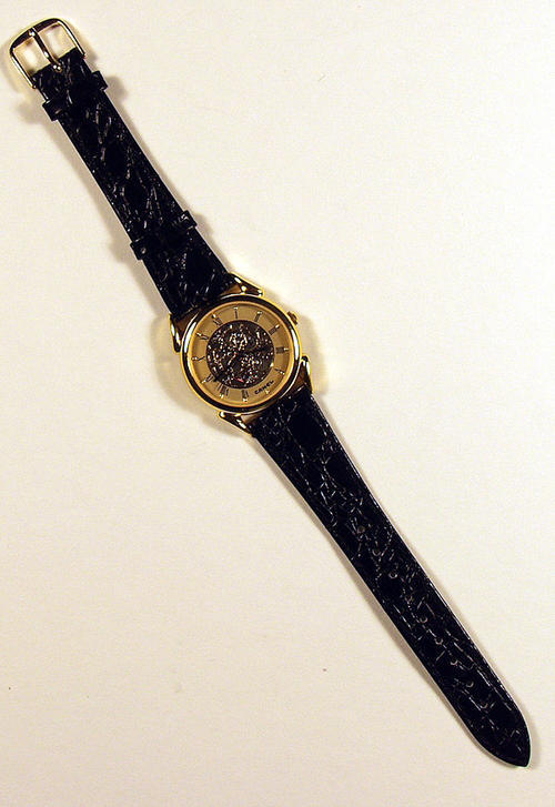 Gold and black watch; fake black leather band, "camel" as the "6" on the face.