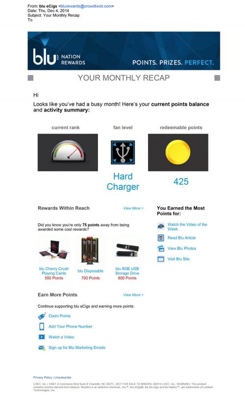 Email received from blu Nation Rewards on December 4, 2014 containing recipient's "monthly recap." Email contains current point balance, fan level, activity summary, rewards within reach and ways to earn more points.