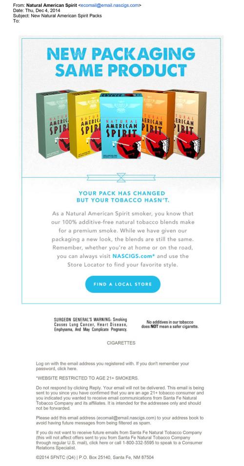 Email received from American Spirit informing recipient that the packaging has changed. Email also reminds user to log into brand website and use the store locator to find their favorite pack in stores. Text: "Your Pack Has Changed But Your Tobacco Hasn't."