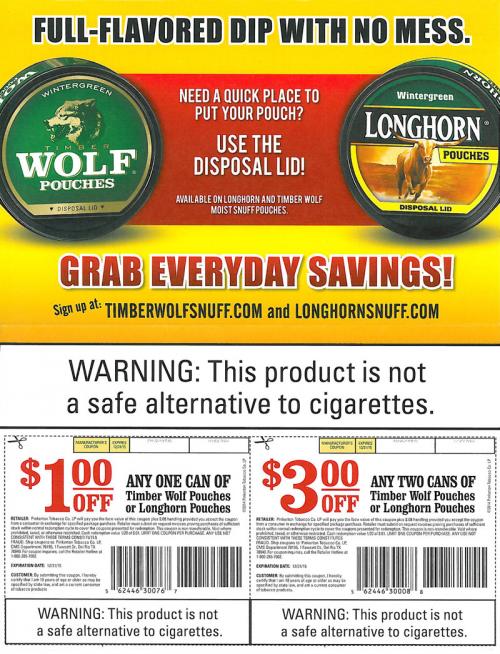Direct mail received from Timber Wolf and Longhorn Snuff in November 2014 promoting pouches and convenient disposal lid cans. The piece also includes 2 coupons for recipient to cut out. Text: \"Full-flavored dip with no mess. Need a quick place to put your pouch? Use the disposal lid!\"