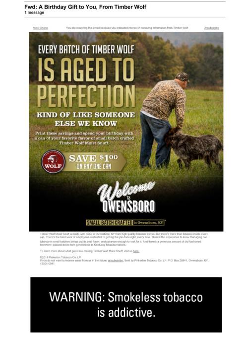 Email received from Timber Wolf in December 2014 wishing the receiver a happy birthday and also presenting the receiver with a coupon. Text: "Every batch of Timber Wolf is aged to perfection kind of like someone else we know. Print these savings and spend your birthday with a can of your favorite flavor of small batch crafted Timber Wolf Moist Snuff."