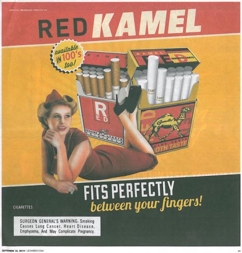 Red Kamel ad with vintage-style art. Text: "Fits perfectly between your fingers!"