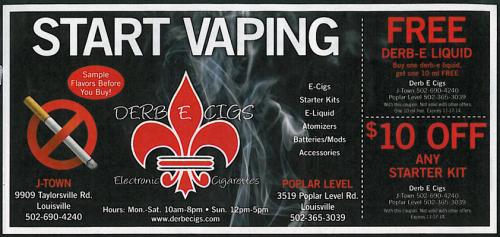 1/3 page ad for Derb E-cigs found in a coupon circular (Clipper Magazine) in the Louisville, KY area. Includes coupons for a discount off a starter kit and a free cartridge with purchase.
