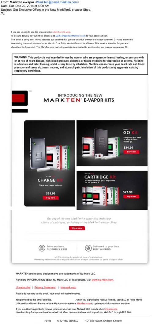 Email promoting the new MarkTen e-vapor kits available from the brand website store.