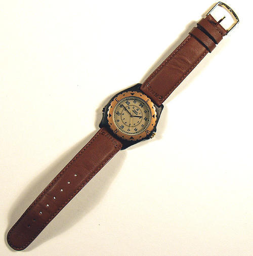 Watch, brown Timex indiglo face, "Camel" on band of fake brown leather.