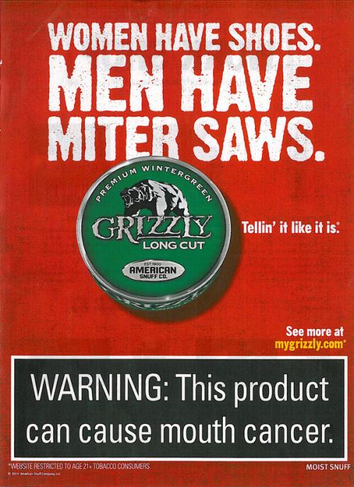 Grizzly ad as part of the "Tellin' it like it is" campaign. Text: "Women have shoes. Men have miter saws."