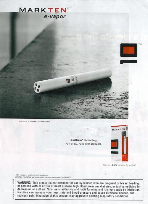 MarkTen magazine ad shows one of their e-cigs and a smaller image inset of the product in a box. Text: "FourDraw technology. Full draw. Fully rechargeable."