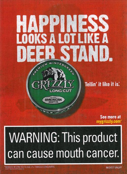 Grizzly ad from the "Tellin' it like it is" series with a hunting theme. Text: "Happiness looks a lot like a deer stand."
