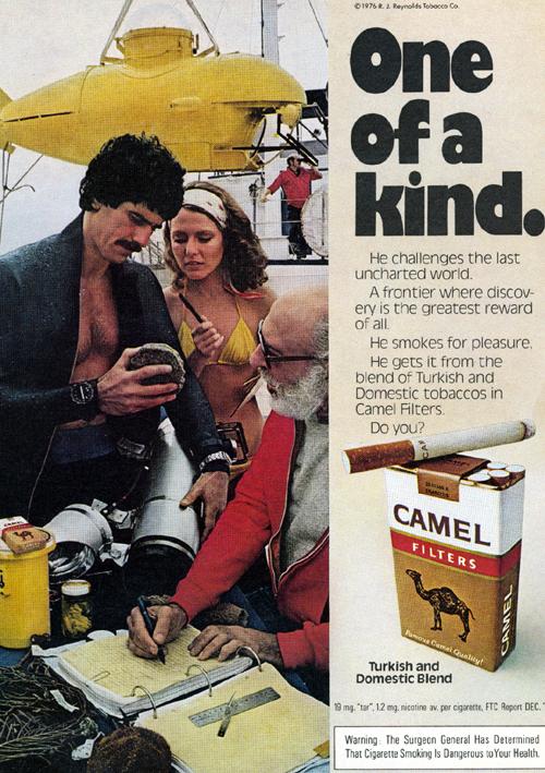"One of a kind. He challenge the last uncharted world. A frontier where discovery is the greatest reward of all. He smokes for pleasure. he gets it from the blend of Turkish and Domestic tobaccos in Camel Filters do you?"