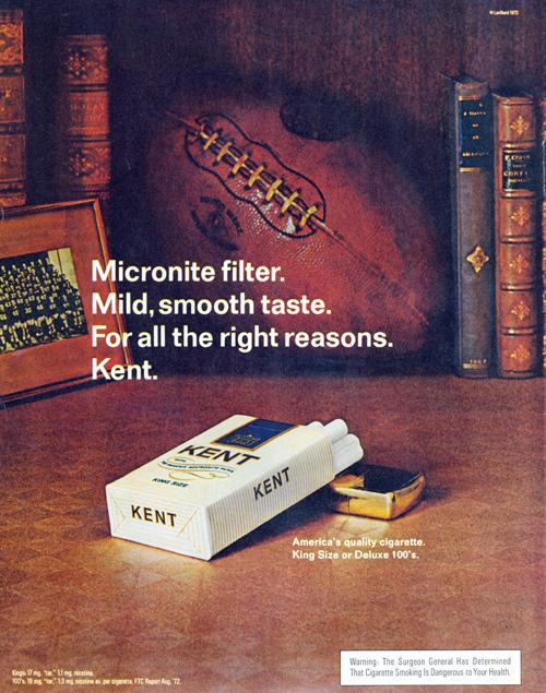 Magazine ad for Kent cigarettes. "Micronite filter. Mild, smooth taste. For all the right reasons. Kent." "America's quality cigarette. King-size or Deluxe 100s."