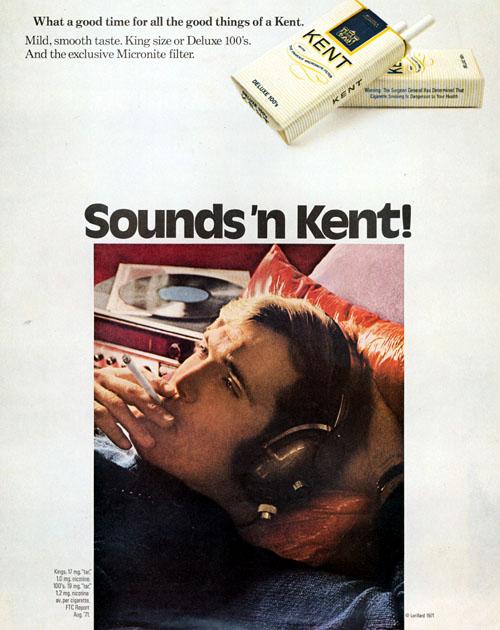 Magazine ad for Kent cigarettes featuring a man laying in bed with headphones on and smoking a cigarette. "Sounds'n Kent! What a good time for all the good things of a Kent. Mild, smooth taste. King size or Deluxe 100's. And the exclusive Micronite filter."