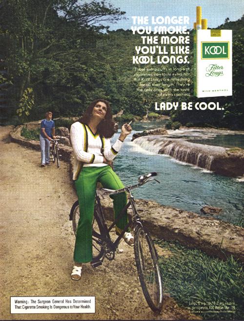 Magazine ad for Kool cigarettes featuring a woman riding her bike while smoking. "The longer you smoke, the more you'll like KOOL Longs. Those extra puffs in long-size cigarettes can taste extra hot. But Kool Longs are refreshing for all their length. They're the only ones with the taste of extra coolness. Lady be cool."