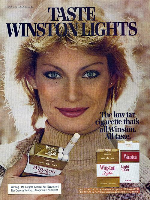 Ad for Winston Lights and Lights 100's. "The low tar cigarette that's all Winston. All taste." Shows a close-up of a smiling woman's head and shoulders as she is offering a cigarette from a pack she is holding. Ad found in Woman's Day August 7, 1978.