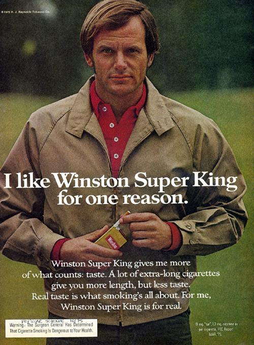 Ad for Winston Super Kings. Image shows a man with a serious expression standing in a field while pulling a cigarette from a pack. The ad copy is phrased as his opinion. Text: "Real taste is what smoking's all about. For me, Winston Super King is for real."
