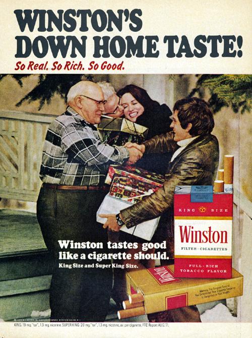 Ad for Winston's King and Super King products, promoting Winston's "down home taste." Image shows a man and woman affectionately greeting an older man and woman, likely supposed to be parents or in-laws. The older man is smoking and the young man and woman are holding Christmas presents.