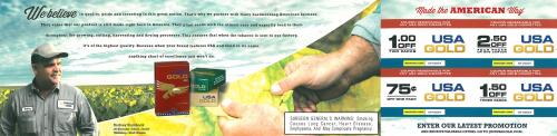 Direct mail from USA Gold received in February 2015 containing coupons. The direct mail features fifth generation American tobacco farmer, Rodney Stainackand and  provides some history on USA Gold tobacco. Text: "Real American values run in the family."