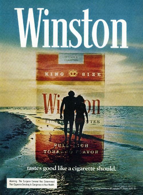Ad for Winston showing a couple walking along the beach at sunset. The giant image of a cigarette pack is superimposed over the scene. Ad found in Playboy June, 1974.