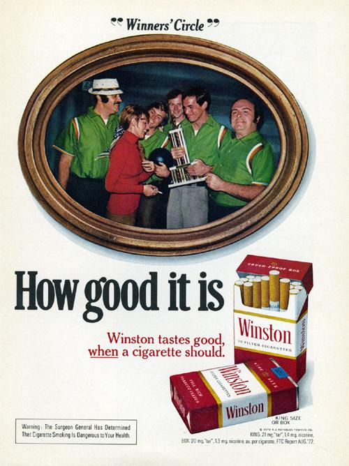 Ad for Winston, part of the "How good it is" series. Image shows a team of men surrounding a woman and holding a bowling trophy and a bowling ball. Caption reads, "Winners' Circle."