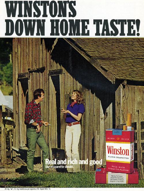 Ad for Winston's "down home taste." Image has a woman and man smoking and laughing outside near a rustic barn. Ad found in Playboy September, 1971.
