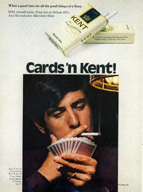 Magazine ad from Kent featuring a man smoking a cigarette while playing a game of cards. Text: "Cards'n Kent! What a good time for all the good things of a Kent. Mild, smooth taste. King size or Deluxe 100's. And the exclusive Micronite filter."
