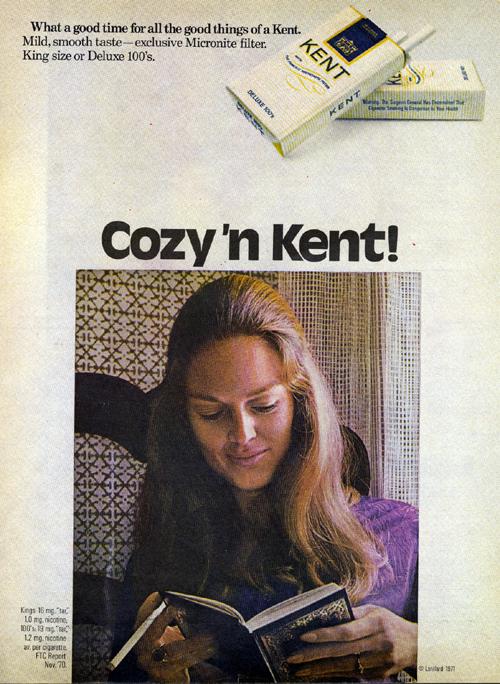 Magazine ad from Kent featuring a woman smoking a cigarette while reading a book. Text: "Cozy'n Kent! What a good time for all the good things of a Kent. Mild, smooth taste -exclusive Micronite filter. King size or Deluxe 100's."