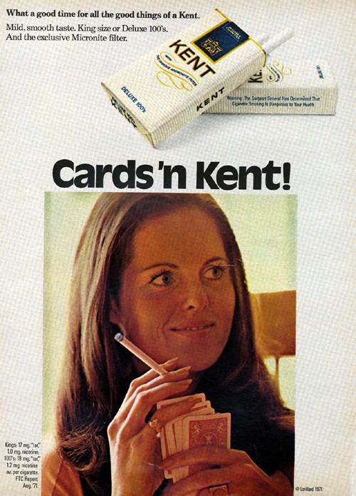 Magazine ad from Kent featuring a woman smoking a cigarette while playing a game of cards. Text: "Cards'n Kent! What a good time for all the good things of a Kent. Mild, smooth taste. King size or Deluxe 100's. And the exclusive Micronite filter."