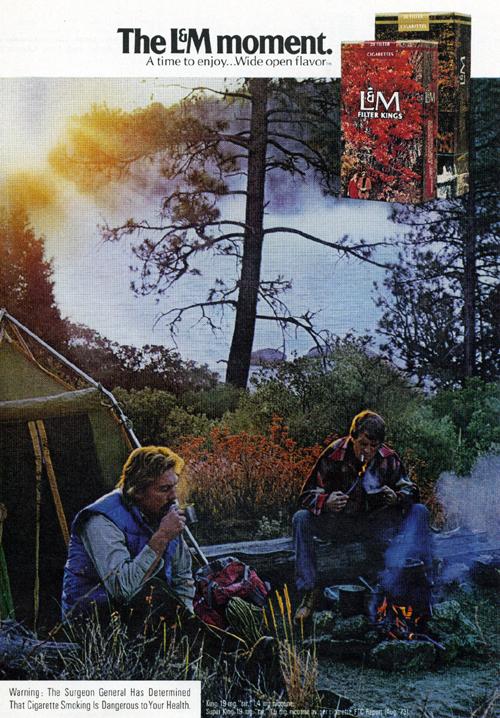 Magazine ad from L&M found in Playboy June 1974. The image shoes two men sitting around a camp fire smoking cigarettes. Text: "The L&M moment. A time to enjoy... Wide open flavor."