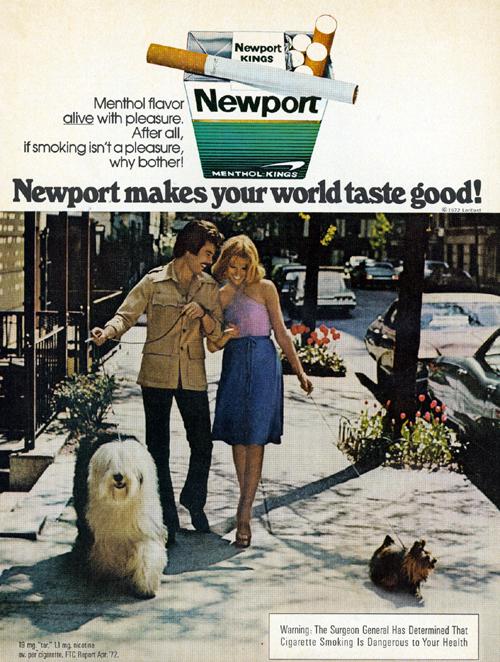 Magazine ad for Newport cigarettes. The image features a man and woman smoking while walking their dogs. Text: "Menthol flavor alive with pleasure. After all, if smoking isn't a pleasure why bother! Newport makes your world taste good!"