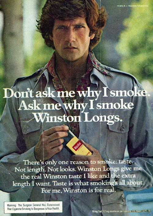 Ad with a serious-looking man holding a pack of cigarettes. "There's only one reason to smoke: taste. Not length. Not looks. Winston Longs give me the real Winston taste I like and the extra length I want. Taste is what smoking's all about. For me, Winston is for real." Ad found in: Family Circle October 1976 Ladies Home Journal July, 1976. Women's Day December, 1976.