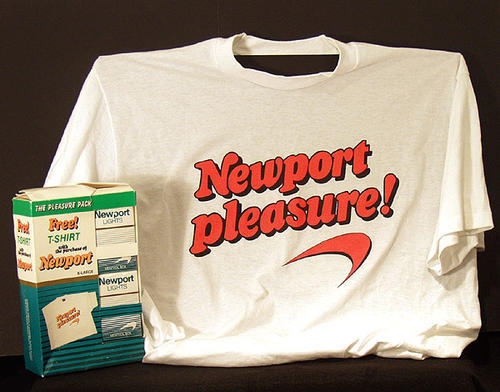 White extra large teeshirt - "Newport Pleasure!" and Newport swoosh in bright orange lettering with black lining. With box - Pleasure pack buy 2, get T-shirt free.