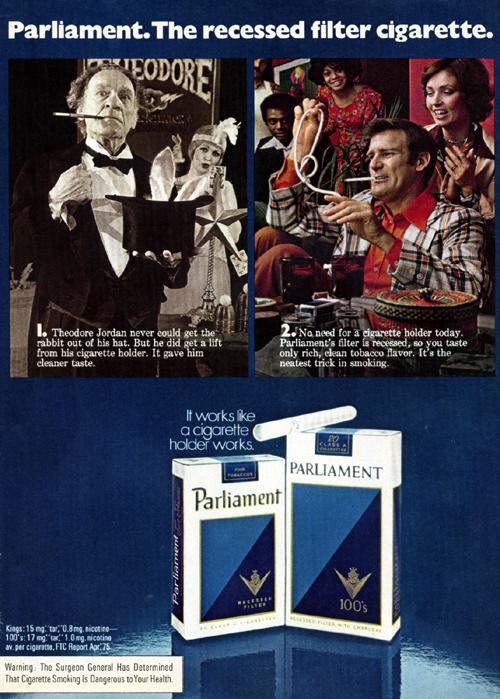 Magazine ad for Parliament found in Family Circle12/75. "Parliament. The recessed filter cigarette. It works like a cigarette holder works."