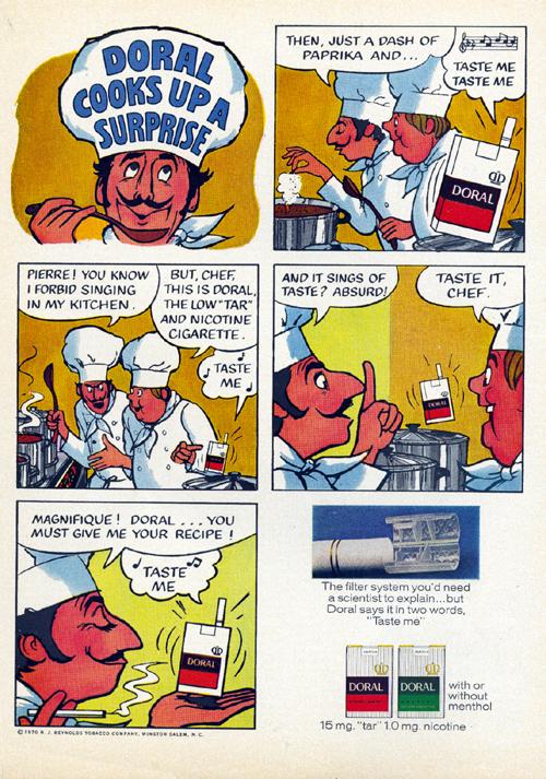 Doral magazine ad found in Playboy June 1971 and McCall's April 1971. Comic strip is of two chefs in the kitchen and the Doral cigarette box singing "Taste me." The chef tells the Doral box, "you must give me your recipe!" Text: "The filter system you'd need a scientist to explain... but Doral says it in two words, "Taste me."