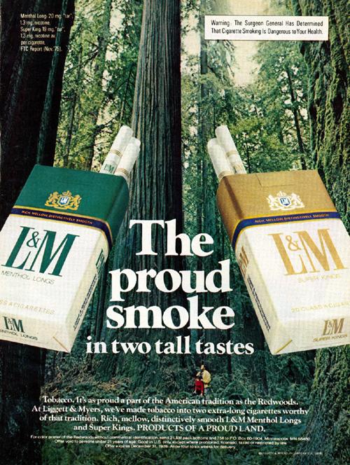 Magazine ad for L&M found in Women's Day June, 1976. "The proud smoke in two tall tastes. Tobacco. It's as proud a part of the American tradition as the Redwoods. At Liggett&Myers, we've made tobacco into two extra-long cigarettes worthy of that tradition. Rich, mellow, distinctively smooth L&M Menthol Longs and Super Kings. Products of a Proud Land."