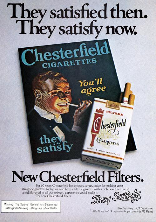 Ad for new Chesterfield Filters cigarettes found in Playboy December, 1974. "They satisfy then. They satisfy now."