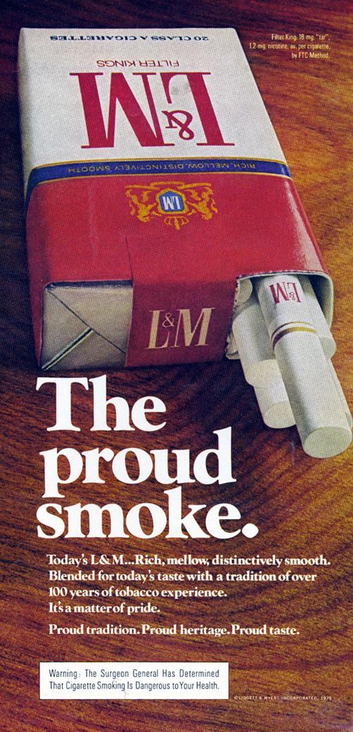 Magazine ad for L&M seen in Playboy September, 1975. "The proud smoke. Today's L&M...Rich, mellow, distinctively smooth. Blended for today's taste with a tradition of over 100 years of tobacco experience. It's a matter of pride. Proud tradition. Proud heritage. Proud taste."