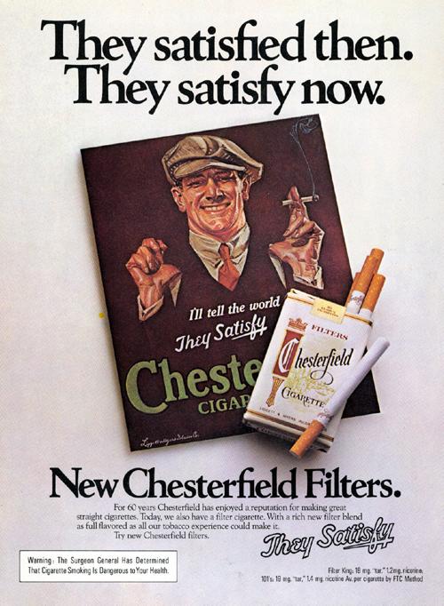 Ad for new Chesterfield Filters cigarettes found in Playboy November, 1974. "They satisfy then. They satisfy now."