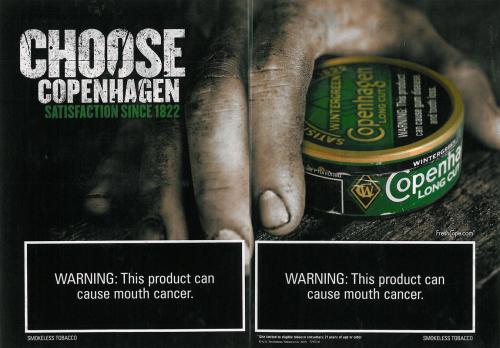 Magazine ad for Copenhagen. Ad image is of a large hand covered in dirt holding a can of Copenhagen Long Cut Wintergreen. Text: "Choose Copenhagen Satisfaction Since 1822" Ad found in: Car and Driver: July 2015