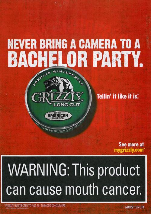 Ad from Grizzly's "Tellin' it like it is" series. "Never bring a camera to a bachelor party."