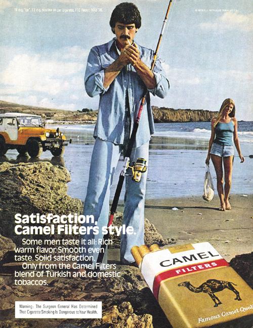 Magazine ad for Camel found in Penthouse October, 1979. Ad image shows a man taking a break from fishing to smoke a cigarette and a woman is walking up to him. "Satisfaction, Camel filters style. Some men taste it all: Rich warm flavor. Smooth even taste. Solid satisfaction. Only from the Camel Filters blend of Turkish and domestic tobaccos."