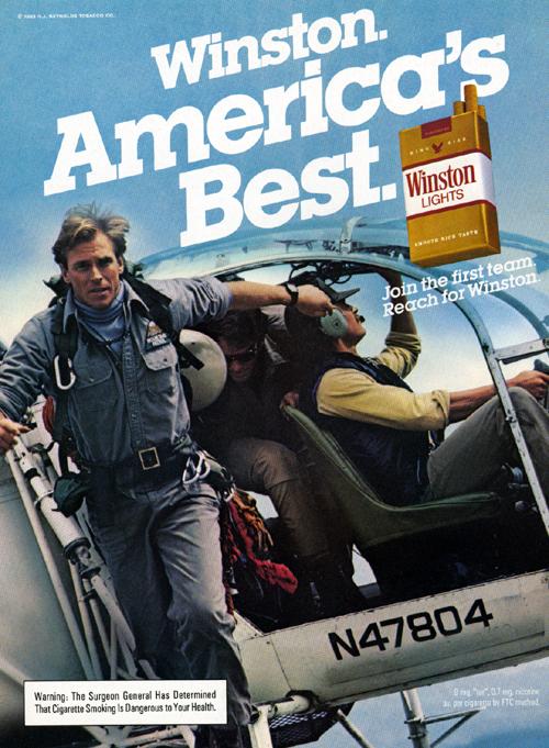 Ad found in Popular Science August 1983. Image features a man jumping out of a helicopter. "Winston. America's Best."