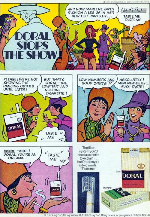 Doral magazine ad found in McCall's October 1971. Comic strip shows singing Doral interrupting the fashion show. Text: "The filter system you'd need a scientist to explain... but Doral says it in two words, "Taste me."